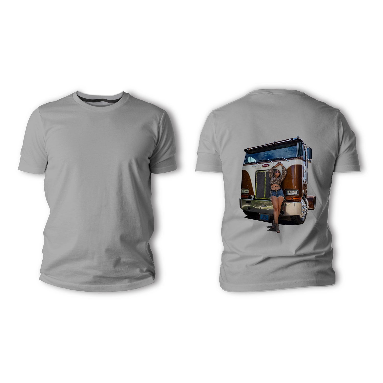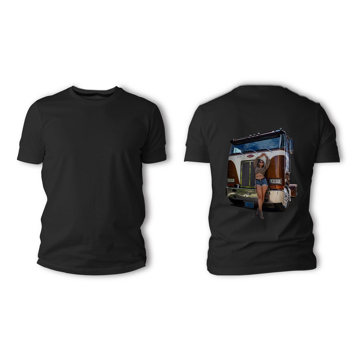 She’s all legs and leather, standing tall in front of a classic cabover that screams old-school cool. Amanda Cabover brings the sass, the stance, and the kind of confidence that doesn’t flinch under diesel power. From head to boots, she’s pure attitude — the kind that turns parking lots into photo ops.