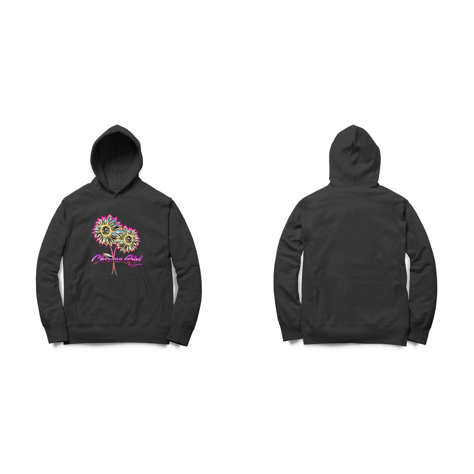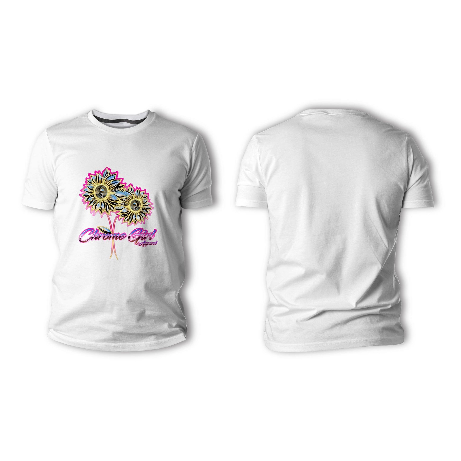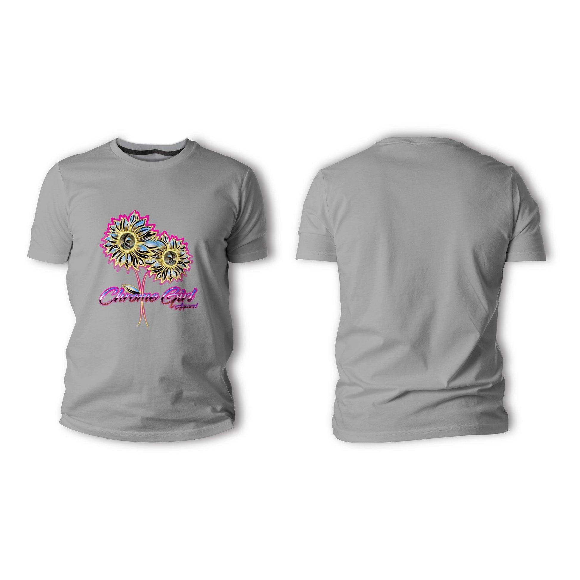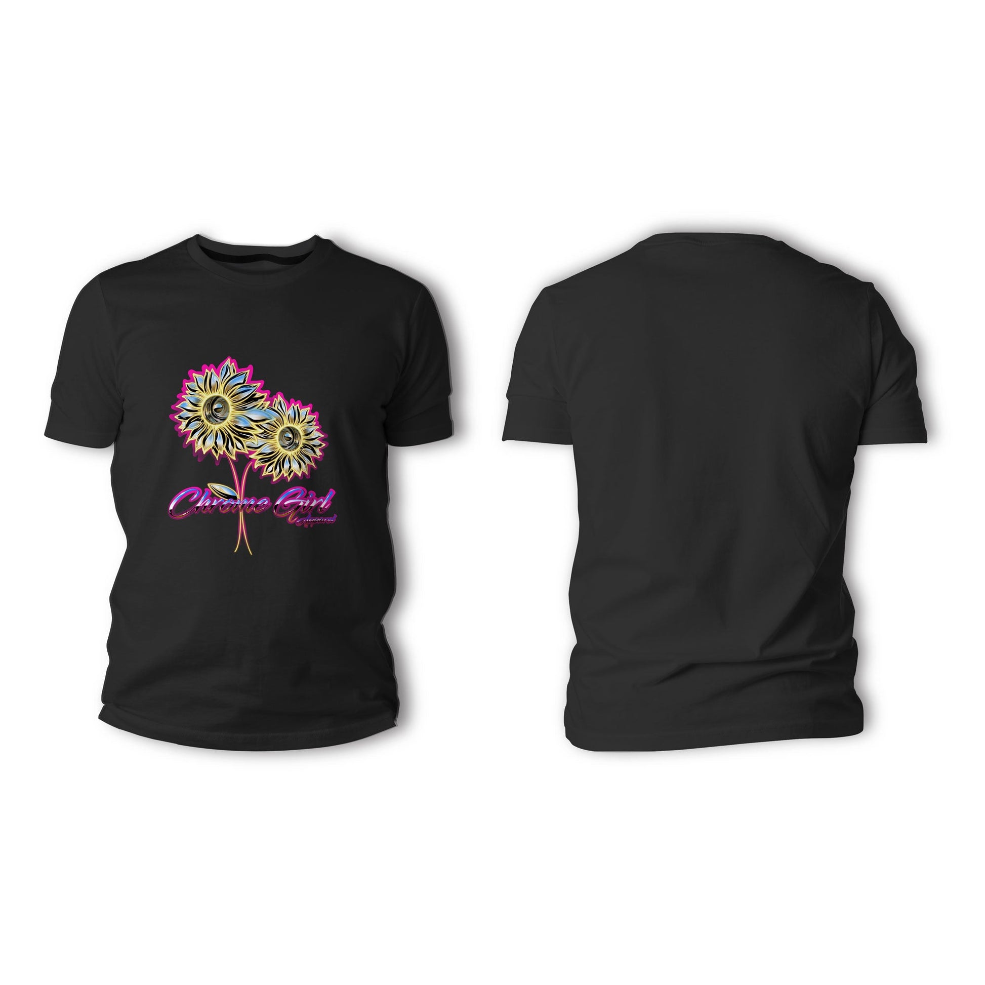 Bold meets beautiful in Flower Chrome Girl, a stunning original drawn by Josh of Rowan Conceptz. This tee features two chrome-styled sunflowers accented with hot pink and gold—symbolizing resilience, radiance, and the power to rise. The “Chrome Girl” script adds a fierce finishing touch, making this design a tribute to women who shine under pressure and grow through anything.