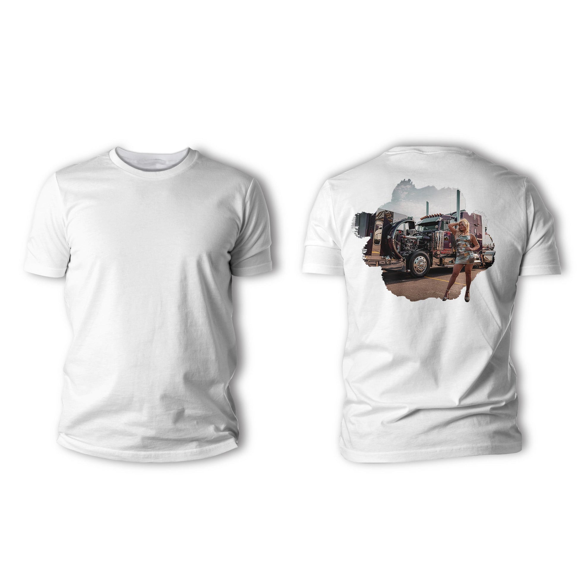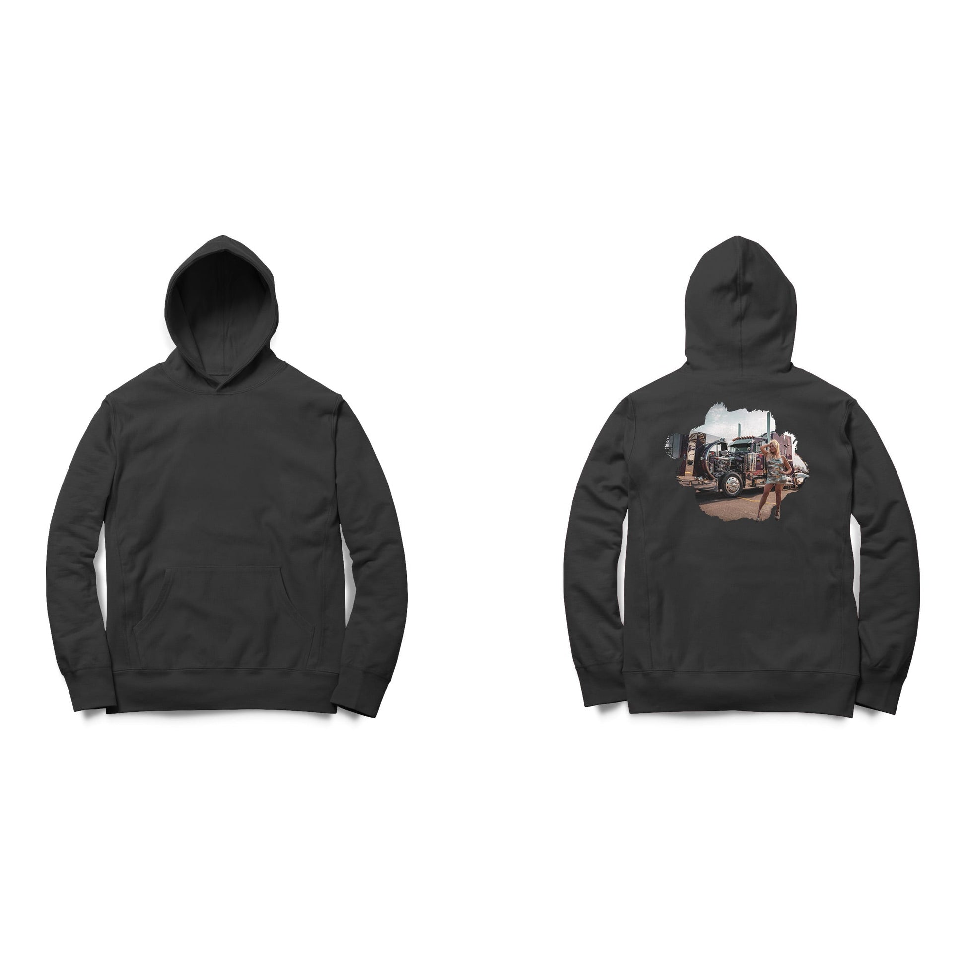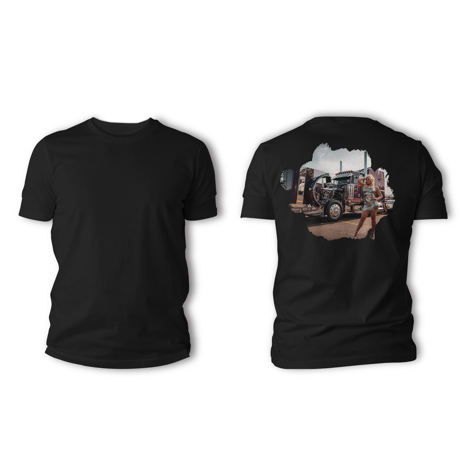This bold photo design captures her striking a confident pose in front of a stunning rig polished to perfection. It's an unapologetic blend of horsepower and style that turns heads wherever you go.