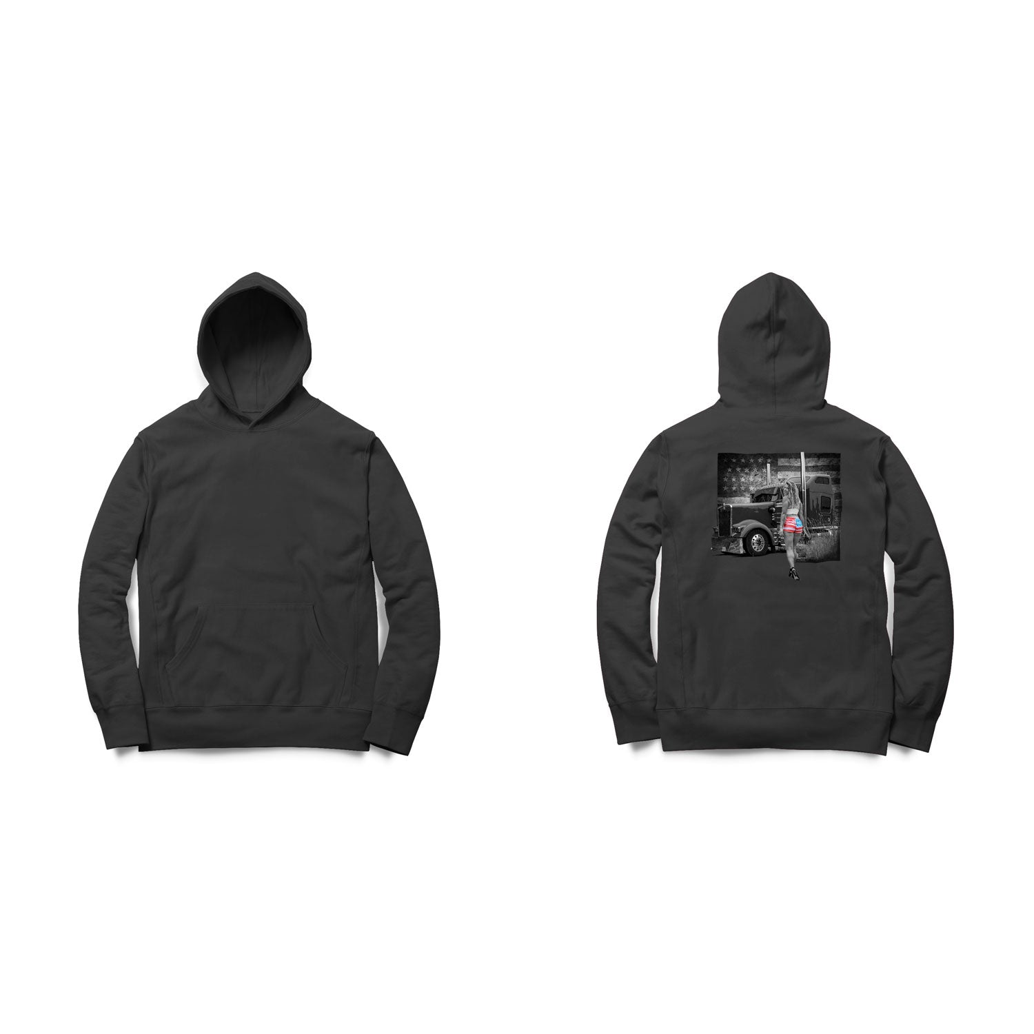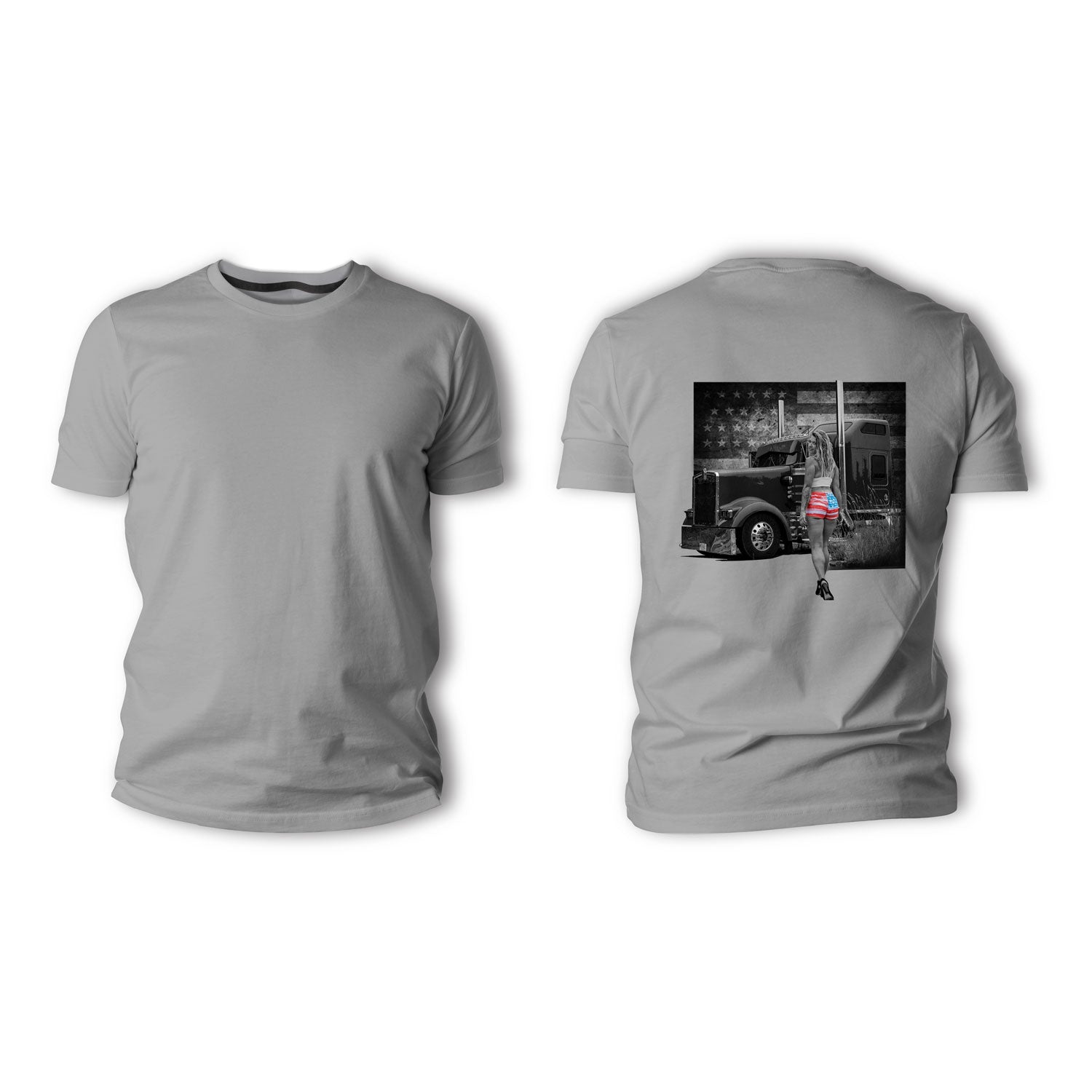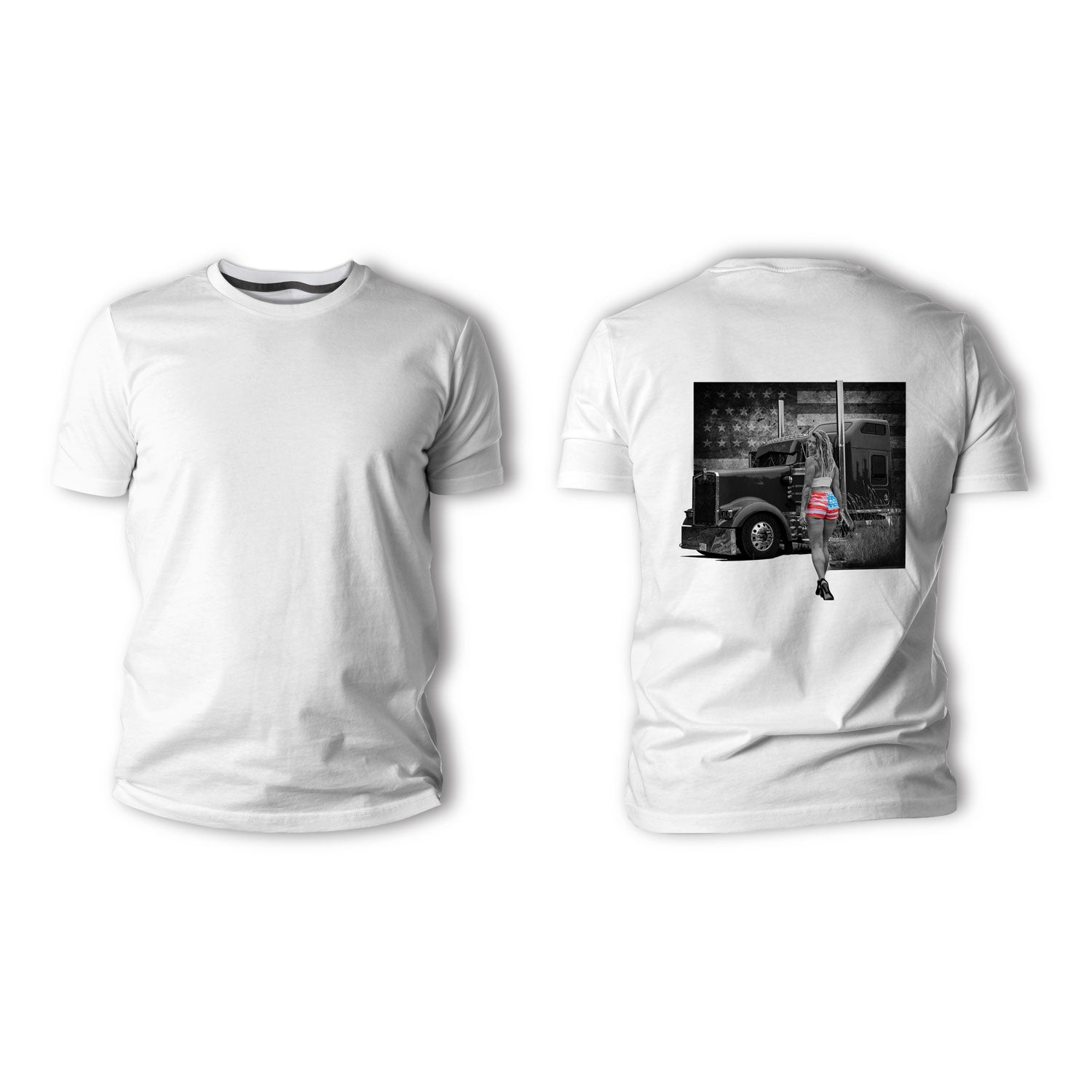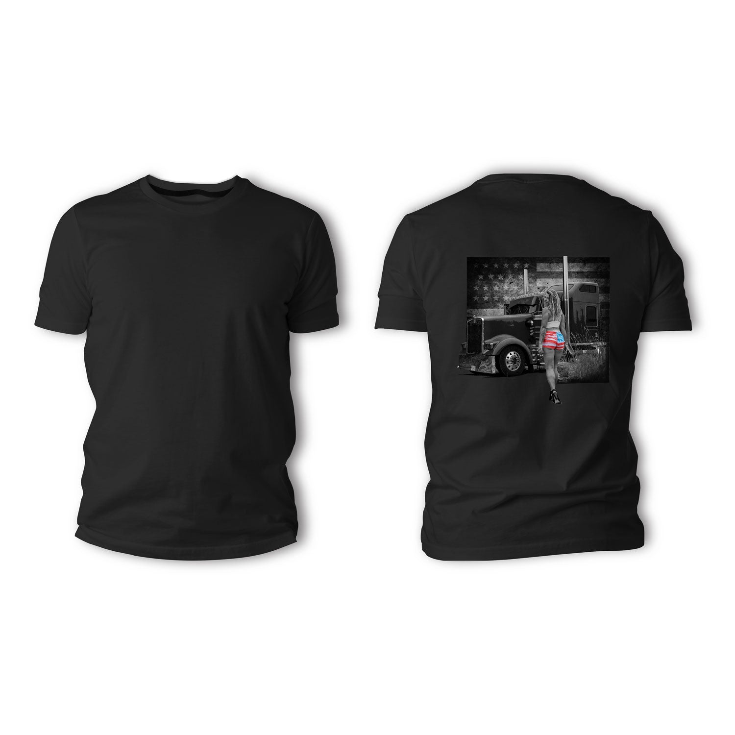 Bold, brazen, and all-American. This design captures the pride of the open road with a star-spangled stunner striking a pose that’s all about freedom and horsepower. Backed by a grayscale flag and a heavy-duty rig, this scene doesn’t whisper—it roars.