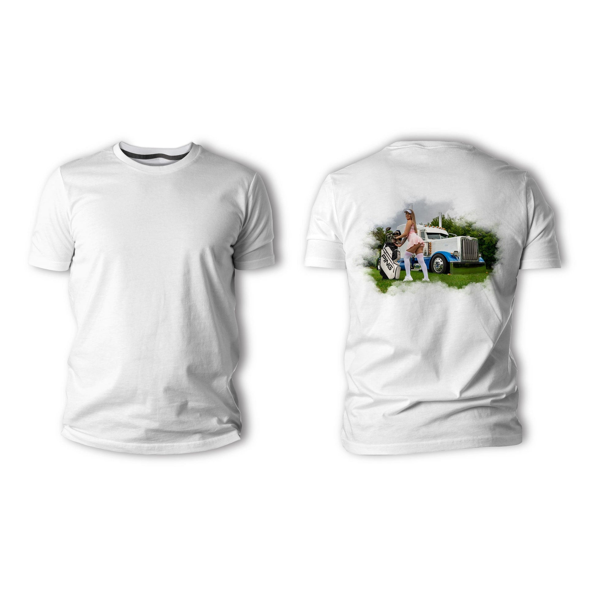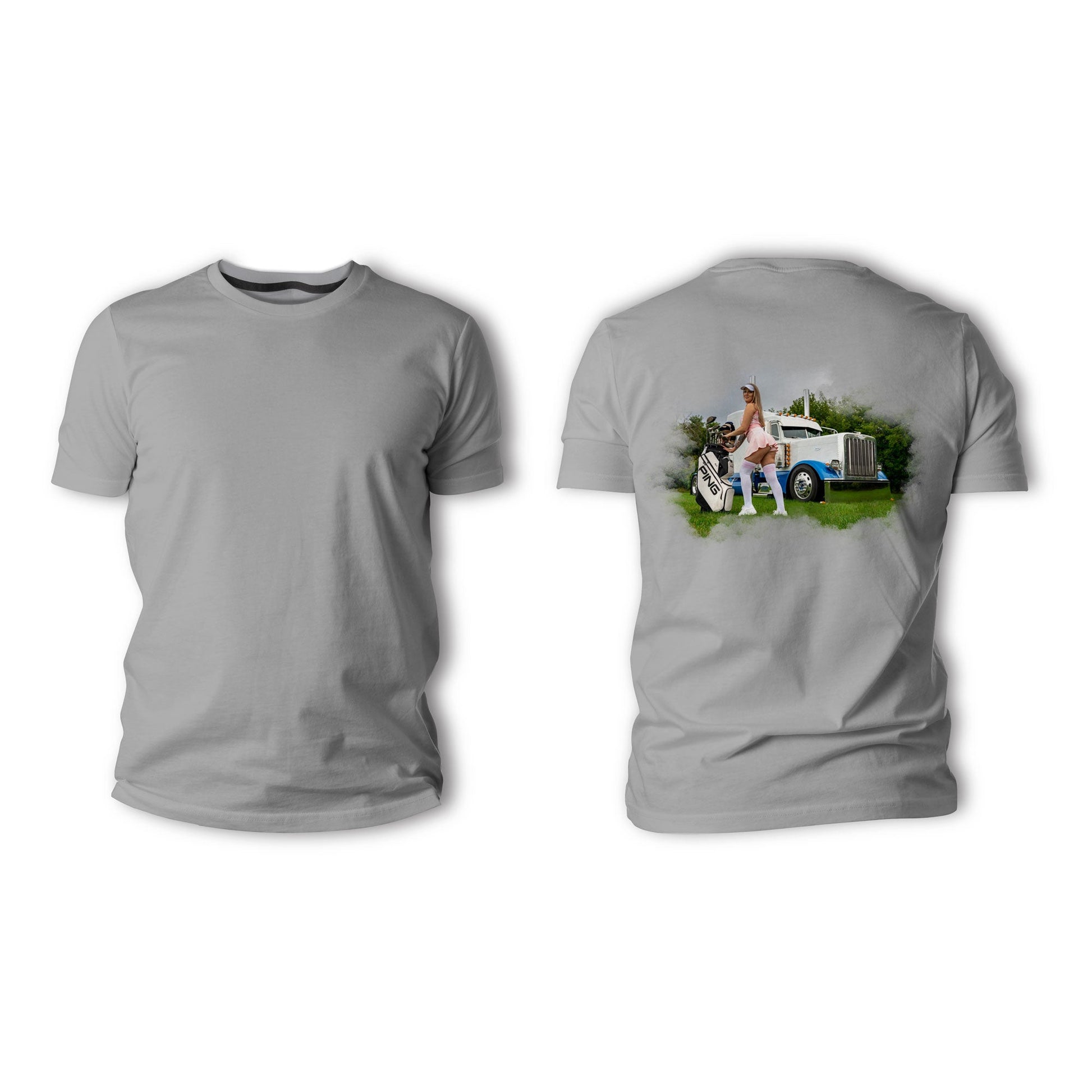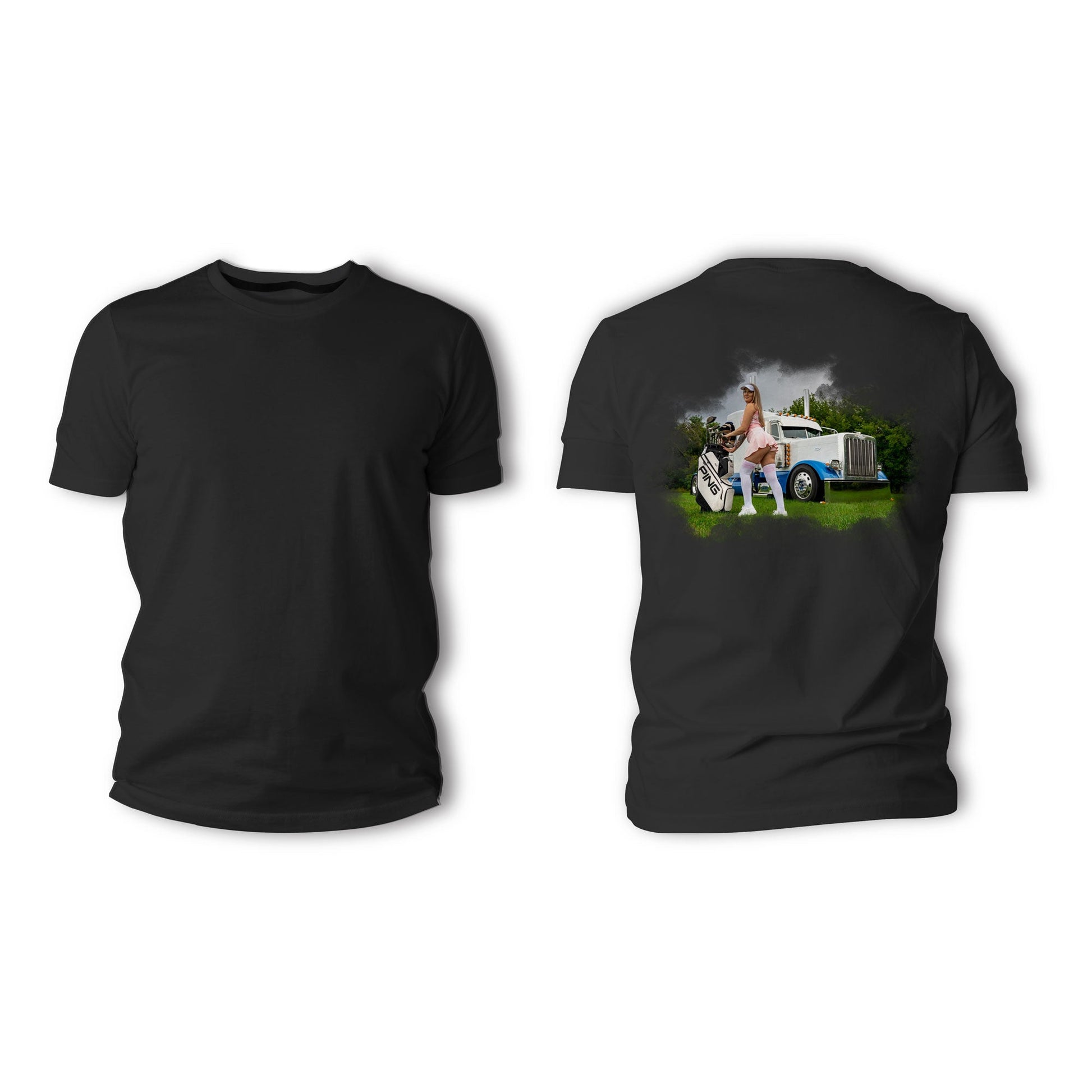 Not your average country club tee. Mia Golf brings fairway fashion to diesel culture with a sassy stance, high socks, and a big rig parked on the green. Posing with her bag of clubs and signature confidence, Mia proves that power and polish go hand in hand—on the road and on the course.