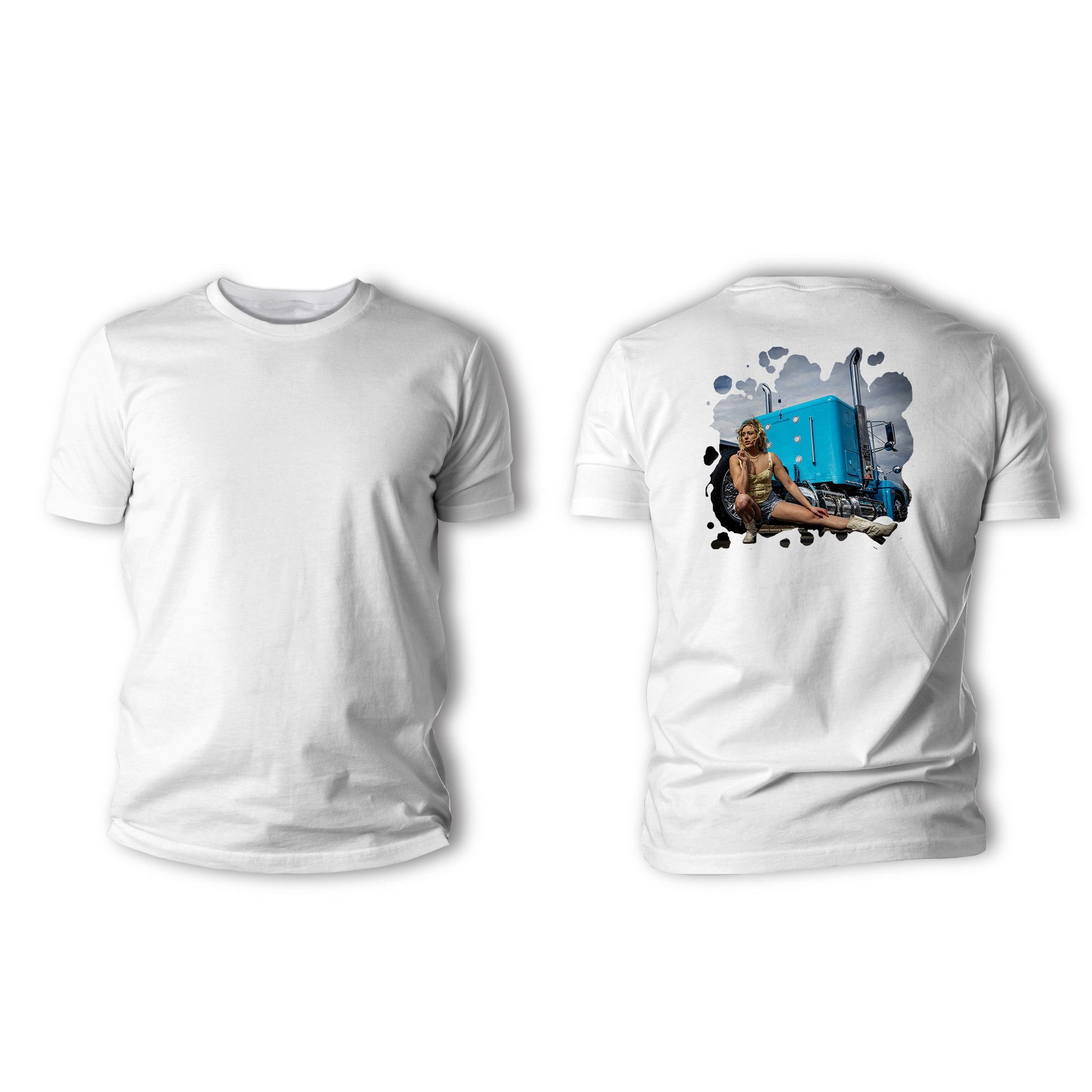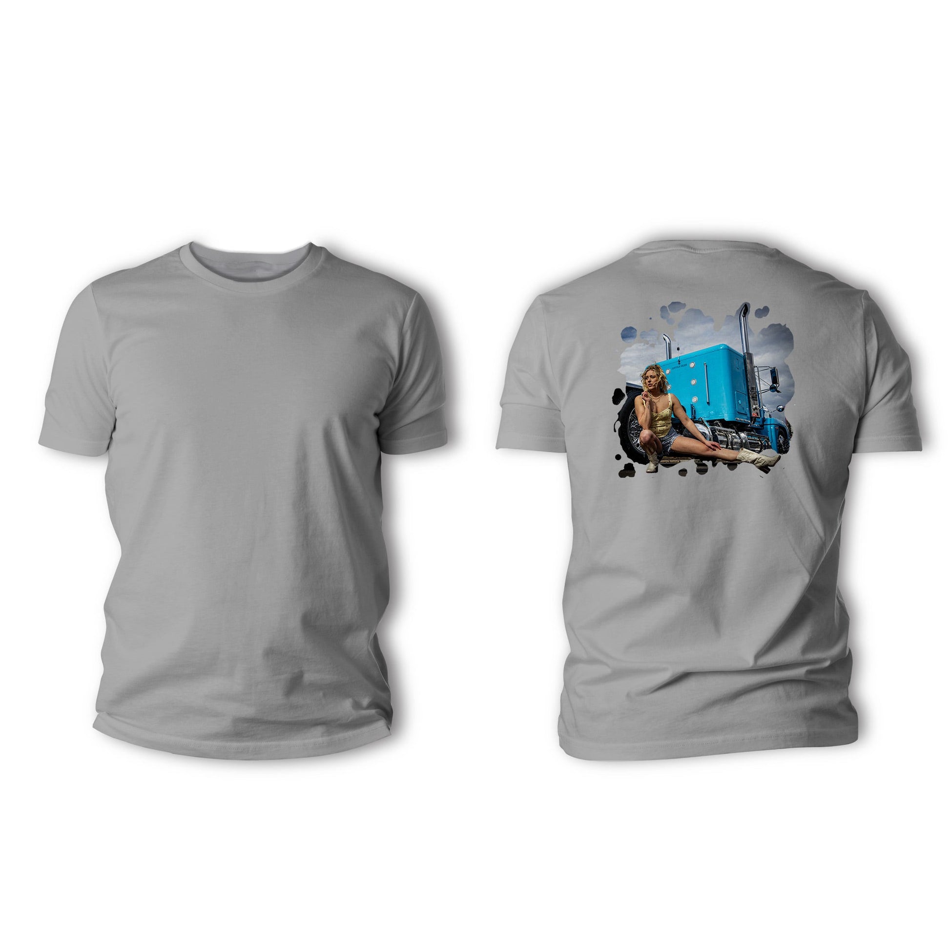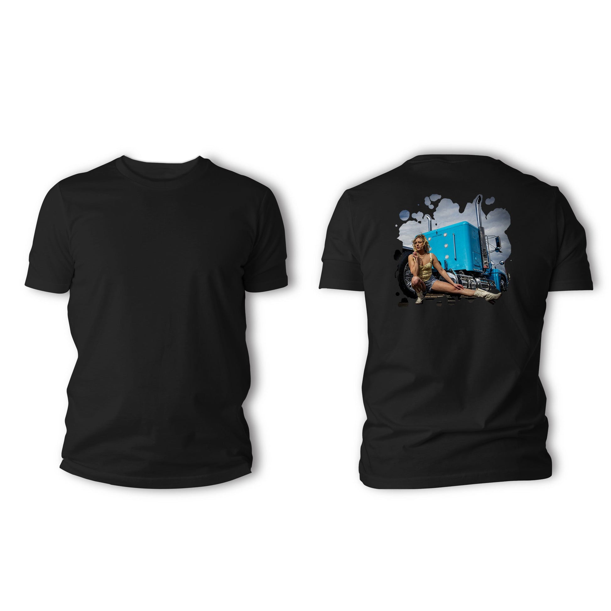 Meet Sami, one of our newest booth babes and already making waves in the trucking scene. Posing in front of “Little Blue”, this bold tee features a clean, high-contrast photo that highlights a bright blue rig and Sami’s signature attitude.