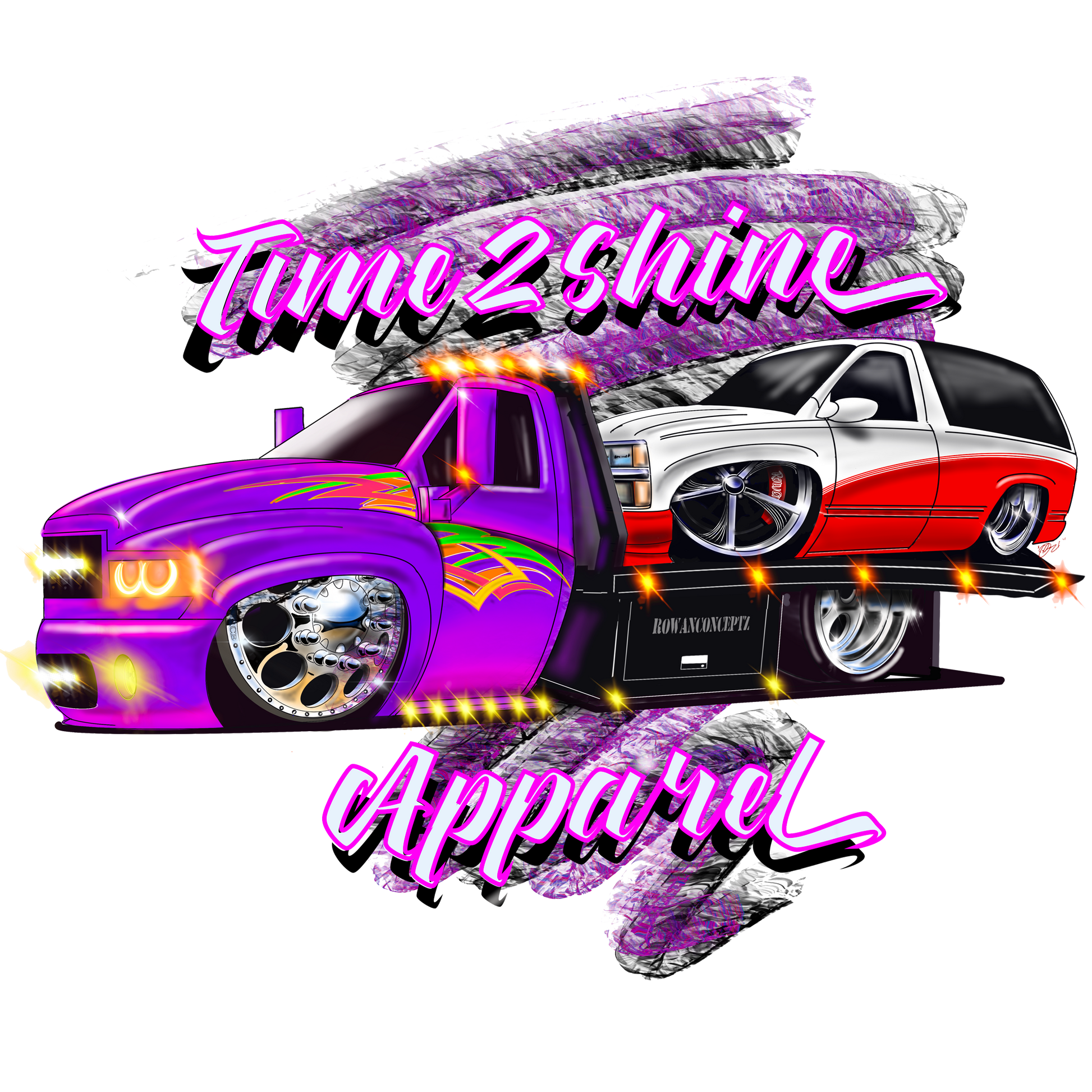 - Vivid show-style artwork featuring slammed tow rig and blazer