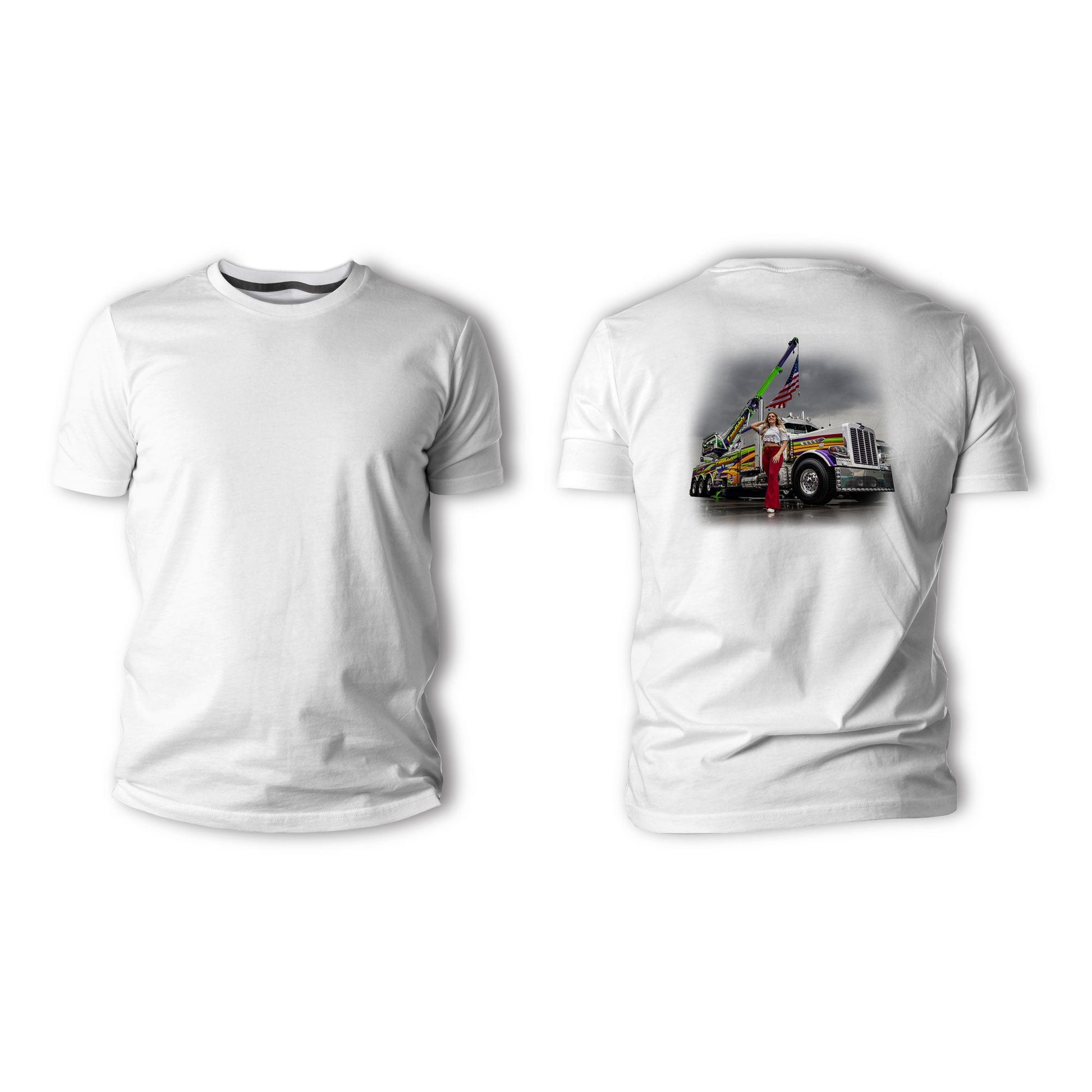 Draped in red, white, and blue and standing tall in front of a wild heavy-duty tow truck, she’s repping the stars and stripes with unmistakable style. This design blends fierce pride with eye-catching shine, perfect for anyone who knows the hustle of keeping America rolling.
